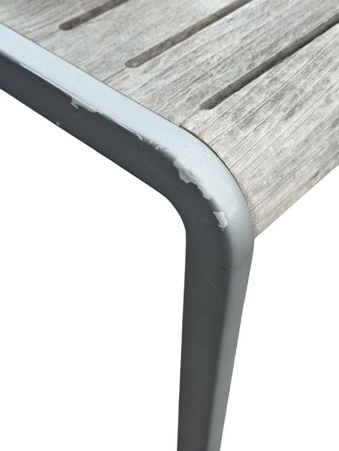 Gloster, Bristol - A contemporary designer teak and metal garden suite. Including a slat top garden dining table on upright square legs. Together with six teak slatted wood chairs of metal construction with maker's mark to back. Table measures approx: 74x156x95cm