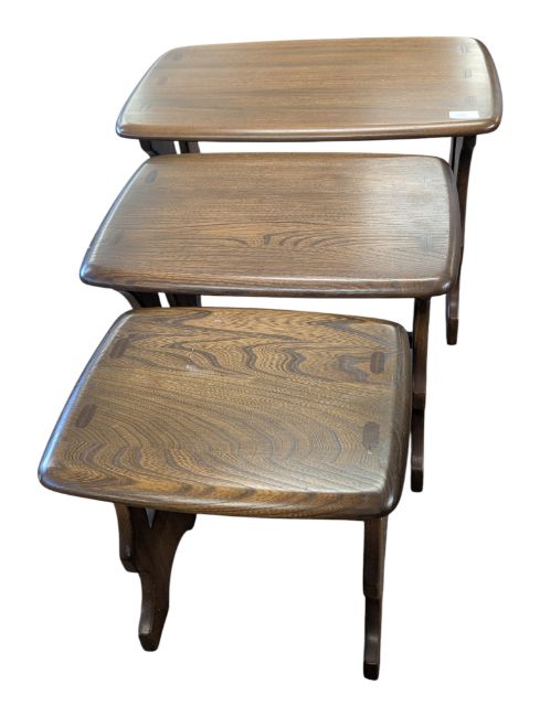Ercol Furniture - Old Colonial - A 20th century Ercol Golden Dawn pattern elm nest of tables. The nest having pierced trestle base to each being united by stretchers. Elm tops above