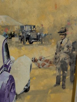 Peter Miller (British, 1939-2014) - No. 79 Bentley - a 20th century oil on canvas painting depicting a classic Bentley under the trees. The Bentley featured being 'DUB 221', a 1937 4 1/4 Litre Pillarless Saloon, bodied by Carlton. Signed to the lower right with notations in pen to the verso. Framed.