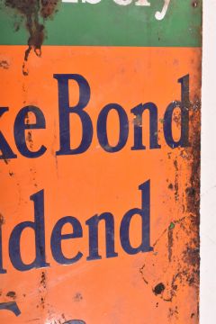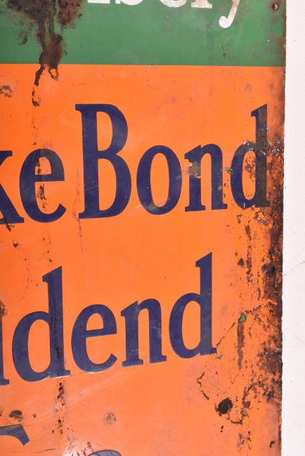 Brooke Bond Tea, Spend Wisely - a vintage 20th-century point of sale / shop display porcelain enamel advertising sign. The sign having an orange and green ground with blue and white notations.