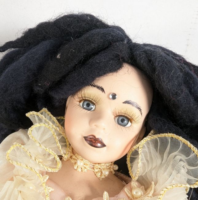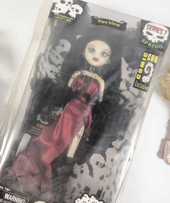 Dolls - a collection of 3x 2000s Y2K gothic fashion dolls, to include; BeGoths 'Atara Inferno' series 7 doll in original packaging, Bleeding Edge Goths doll 'Eva Destruction', and an unmarked porcelain doll with black dreads and detailed flower dress.