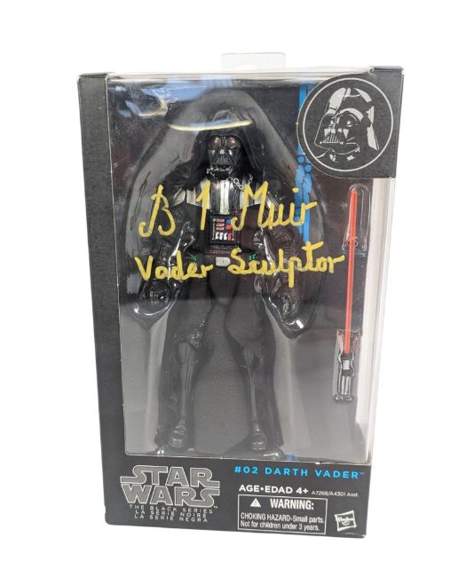 Star Wars - Brian Muir (Darth Vader helmet sculptor) - a boxed Hasbro Blue Line No. 02 Darth Vader Black Series action figure, signed to the front by Brian Muir in yellow ink. As new. Figure measures approx 17cm.