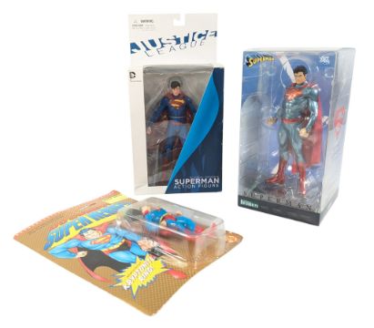 Superman - a collection of x3 assorted Superman action figures comprising a vintage 1989 Toybiz Superman with Kryptonite Ring, DC Kotobukiya 1/10 scale Justice League Superman and DC Collectibles Justice League Superman.