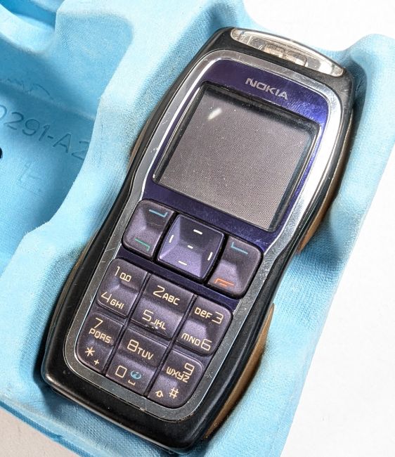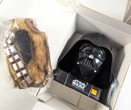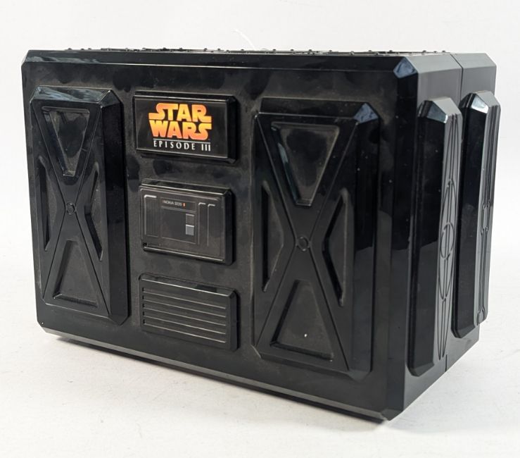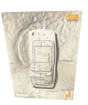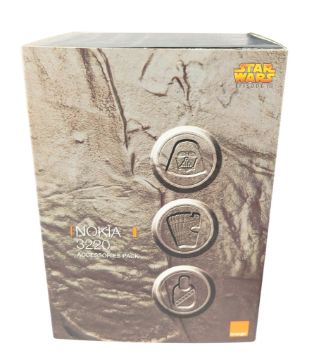 Star Wars - a vintage 1990s Nokia 3220 mobile phone Star Wars Episode 3 accessory pack containing the original mobile device, Darth Vader phone holder, Chewbacca furry carry pouch, interchangeable phone covers and Yoda topup swipe card. Housed in a black carry case with inner cardboard packaging and papers.