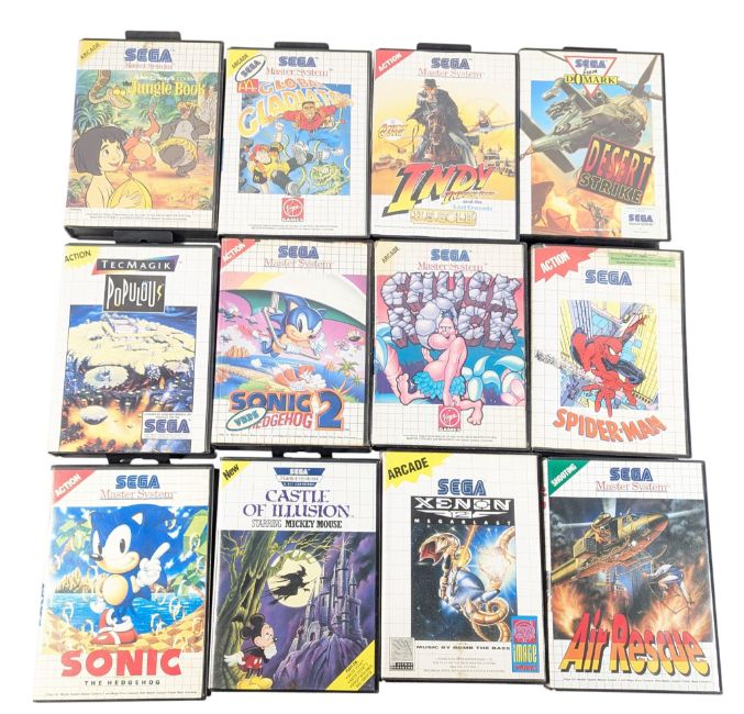 Retro Gaming - x12 original vintage Sega Master System video game console cartridges comprising; Spiderman, Indiana Jones (instructions present), Chuck Rock, Global Gladiators (instructions present), Jungle Book (instructions present), Sonic (instructions present), Sonic 2, Populous (instructions present), Castle of Illusion, Xenon 2, Desert Strike (instructions present) and Air Rescue.