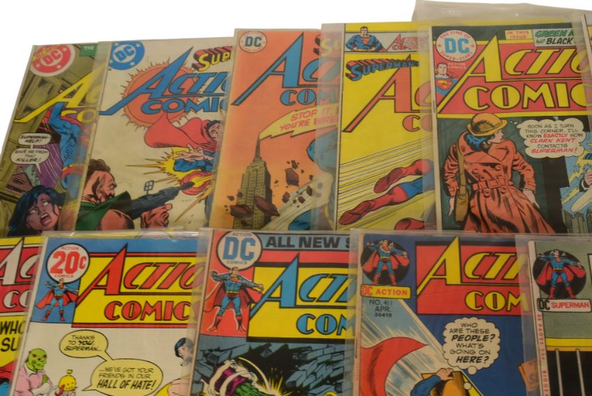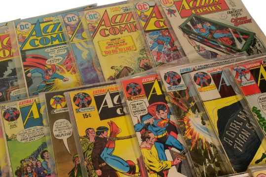 Comic Books - DC Universe - a collection of original vintage 1963-1986 Action Comics Superman comprising; #301-302, #310, #318-319, #323, #382, #389-395, #398-399, #401-407, #411, #415, #417-418, #421, #424, #439-442, #444-446, #455-456, #467, #486, #494, #505-510, #512-514, #517-519, #521, #535, #540, #542-#544, #547-548, #552, #554-555, #557, #560-563, #567-568, #570-573, #575-576, #578-580, and #582-583