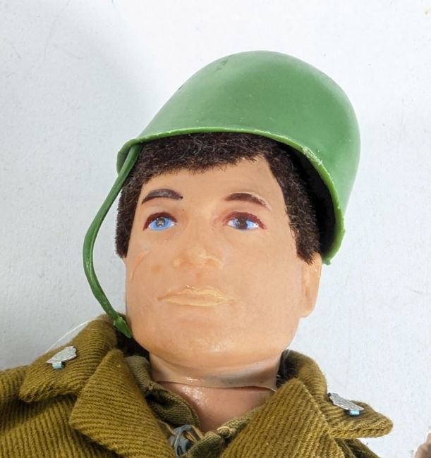Action Figures - 2x retro 1960s Palitoy combat soldier army military action figures, one with full army uniform, helmet and gun accessory, the other undressed, together with a talking commander torso with pull cord.