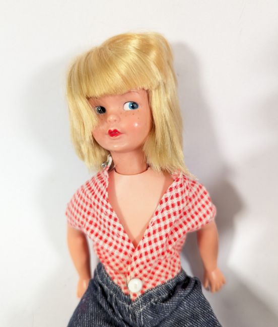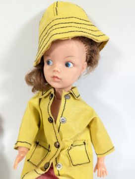 Dolls - a x2 vintage Pedigree Sindy and Patch dolls, to include a brunette Sindy doll, and a blonde haired Patch doll with, together with a selection of original genuine Sindy clothing and other, to include Sou'wester yellow rain jacket and hat, gingham jacket, dresses, shoes, bags and other.