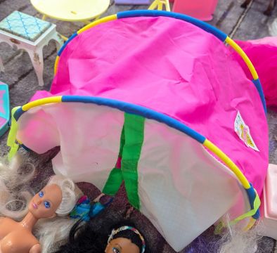 Barbie - Sindy - a large assorted collection of retro Mattel Hasbro/Pedigree 1980's/90's Barbie, Sindy and Lewis Galoob dolls, sets and accessories. To include set items such as; 'Sindy Outdoor Fun' camping tent, 'Tiffany - Sindy's Horse' horse, 'Funtime 4x4 Jeep', and Barbie 'Magic Van' motorhome Voyager camper and a hairdresser/salon set, Lewis Galoob 'Bouncin Kid' Gymnastics tumbling kid and apparatus. Together with a selection of 14x dolls to include; 'Magic Eyes' Sindy doll, Barbei mermaid magic No. 1434, a Sindy mermaid, and other, and a collection of accessories such as beds, cots, stools, clothes, and other.