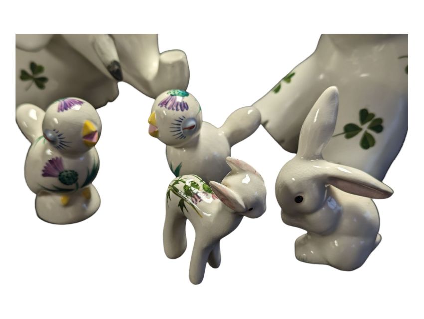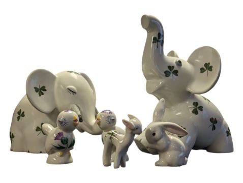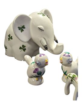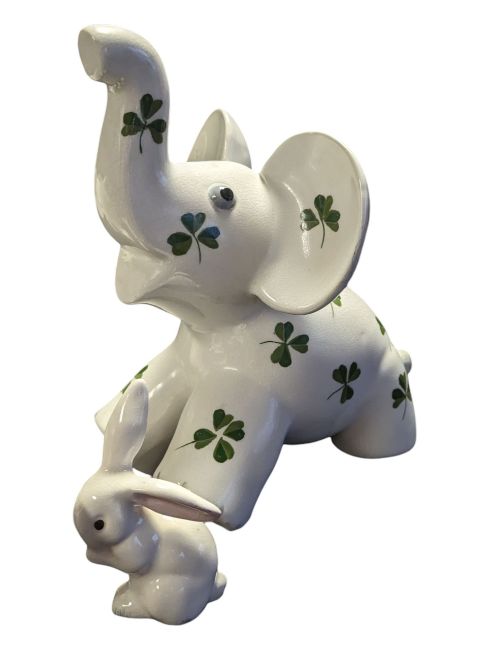 Plichta / Wemyss - A vintage 20th cenutry china elephant with shamrock decoration. Including another exmaple similar size with smaller china animal figures. Maker's mark present.
