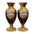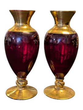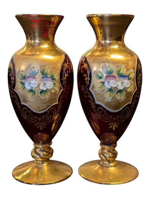 Pair of 19th century Czech ruby & gilt crystal glass bud / stem vases. Hand painted enamel floral decoration in gilt panel with further detail to border. Ruby red glass body on a gilt circular foot.