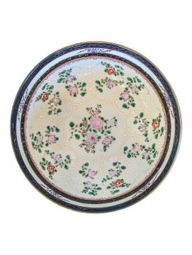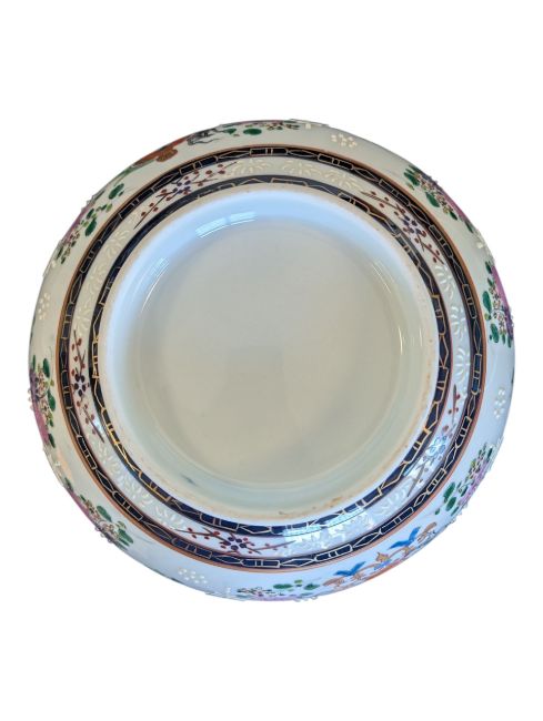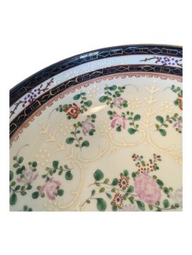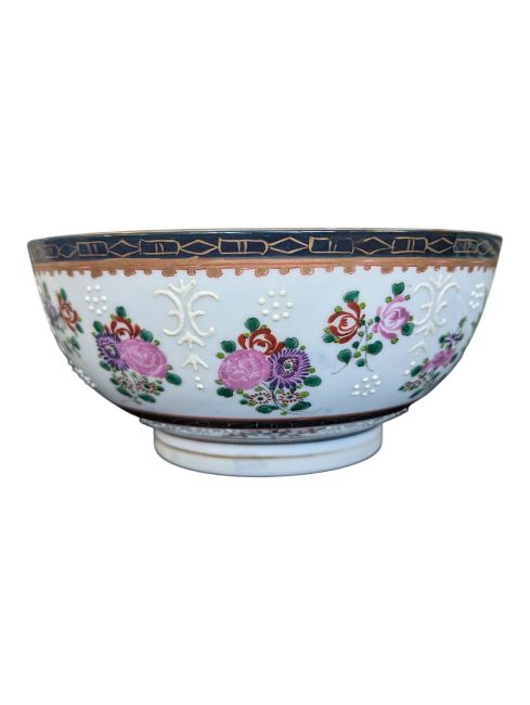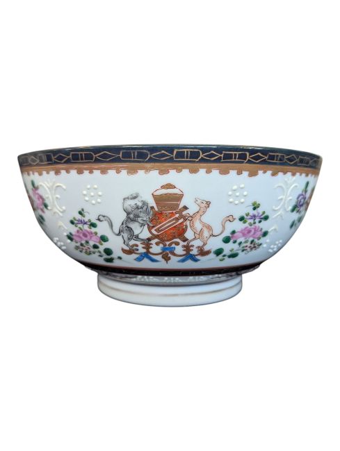 Edme Samson - A 19th century Chinese export Edme Samson porcelain bowl. The bowl having cobalt and gilt rim with enamelled and hand painted florals to interior and exterior and armorial to centre. 10cm x 22cm approx.