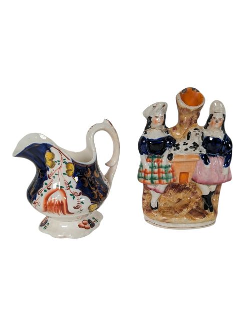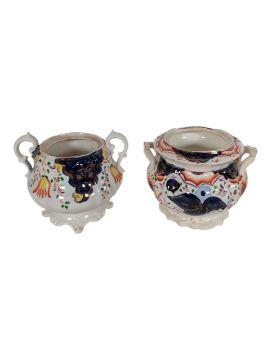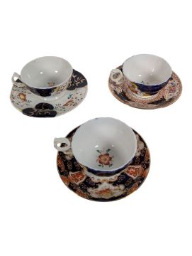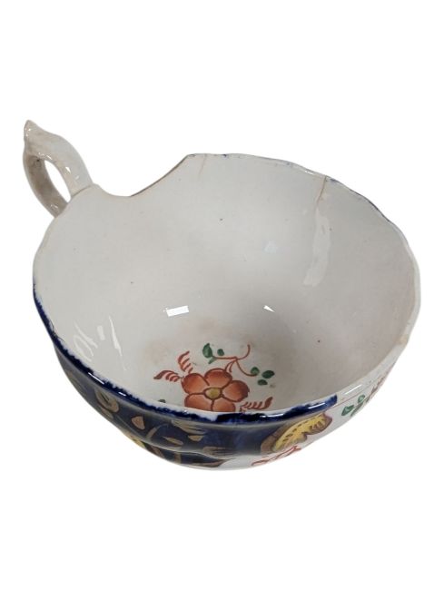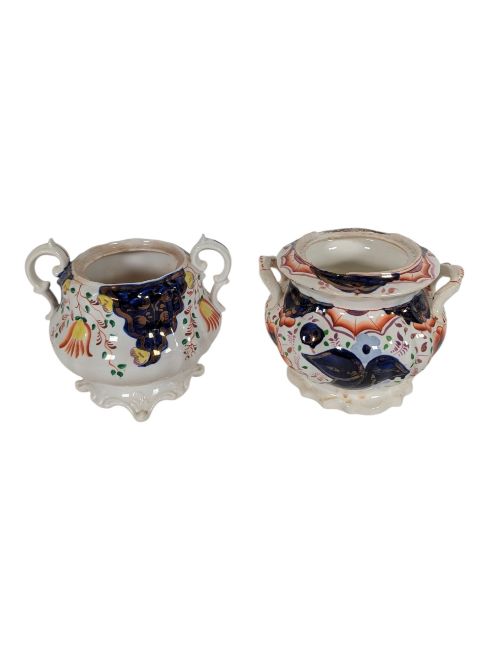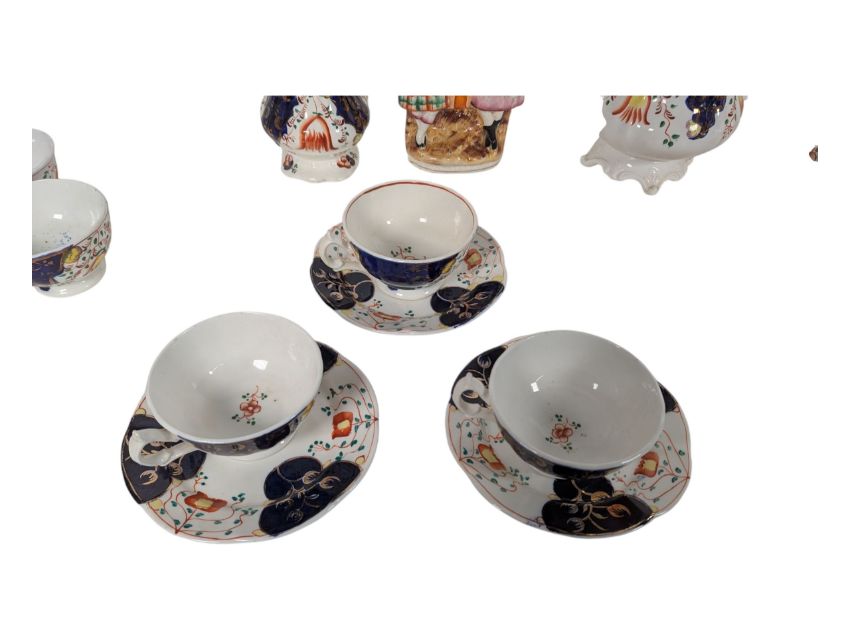 A late 19th century Victorian, part hand painted tea set / service - Gaudy Welsh Swansea ware. Consisting of cups and plates, vase, creamer, etc, each decorated with yellow, orange, blue flora and fauna.