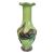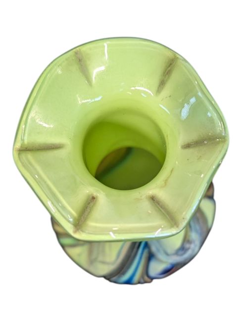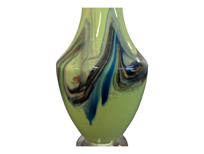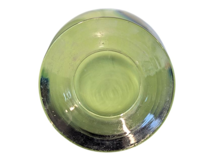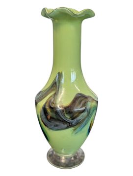 Dalian, Chinese - A vintage 20th century circa 1960s green studio art glass vase. Having a scalloped flared top, into a urn style central column on a clear circular foot.