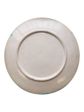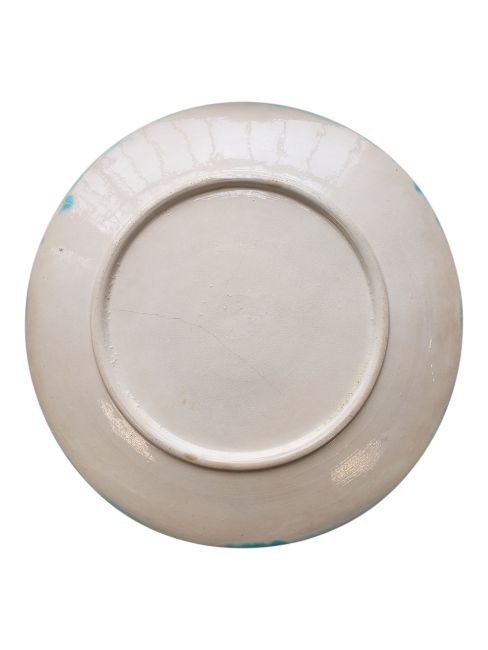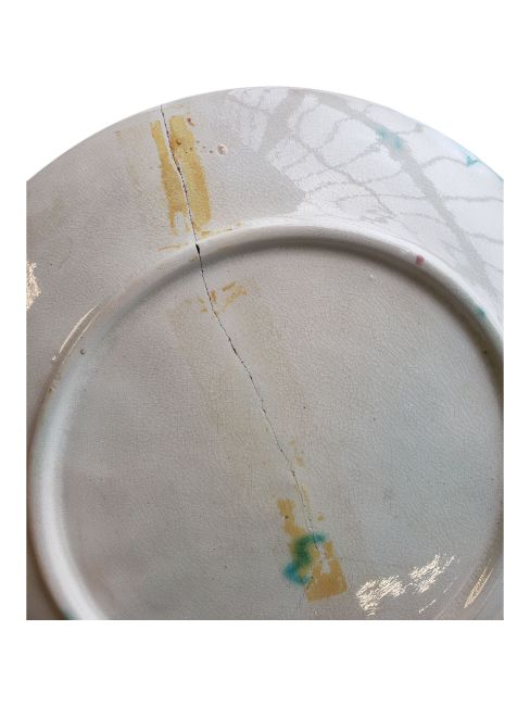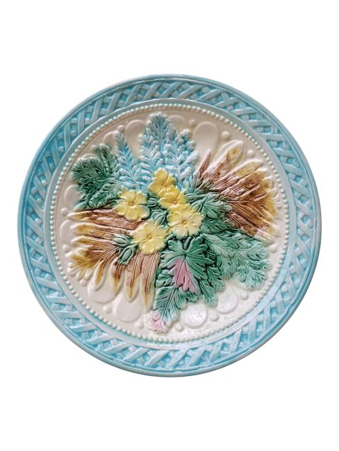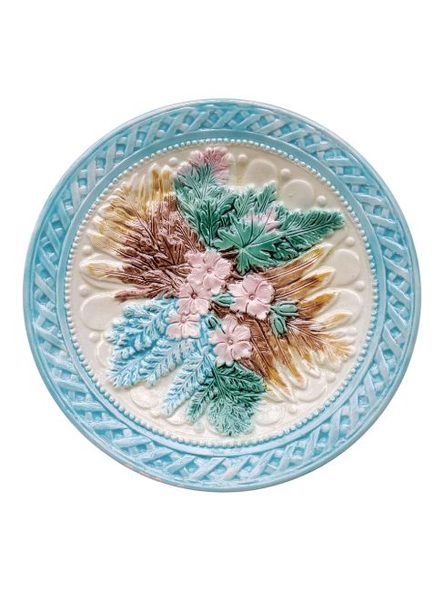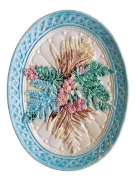 Collection of French 19th century majolica plates. Decorated in a fern and flowers design, in a blue, green, pink and brown colourway. Comprising of two oval serving plates and six round cabinet plates. Largest measuring approx. 27.5cm x 21cm. One af.