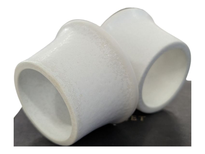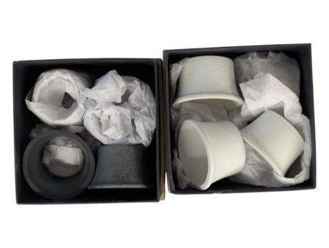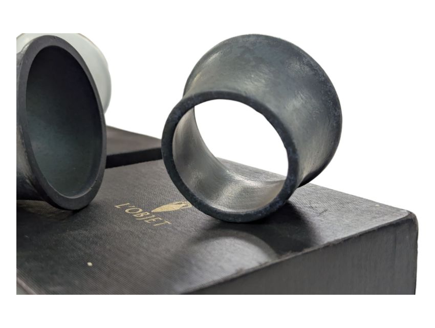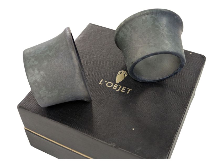 L'Objet, United States - Two sets of designer boxed napkin ring / holders. Four in each branded box, bisque porcelain construction in white and blue.