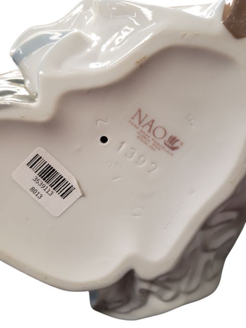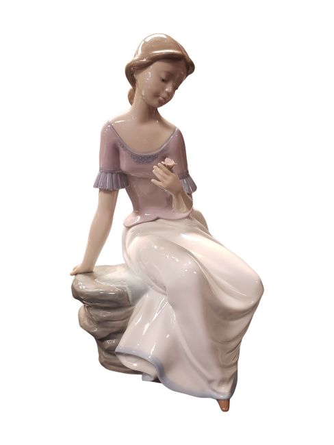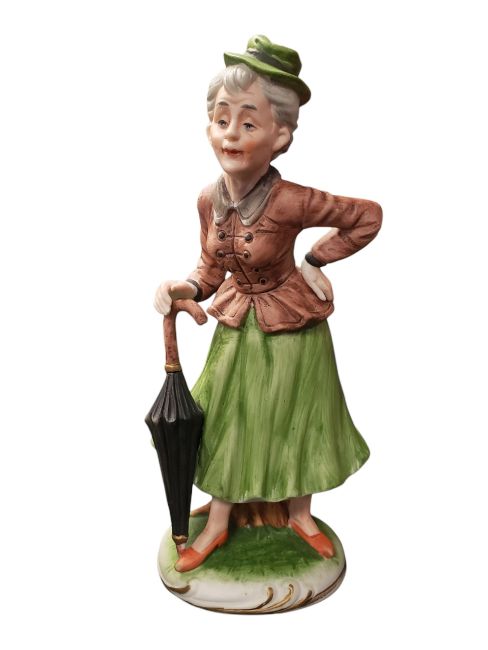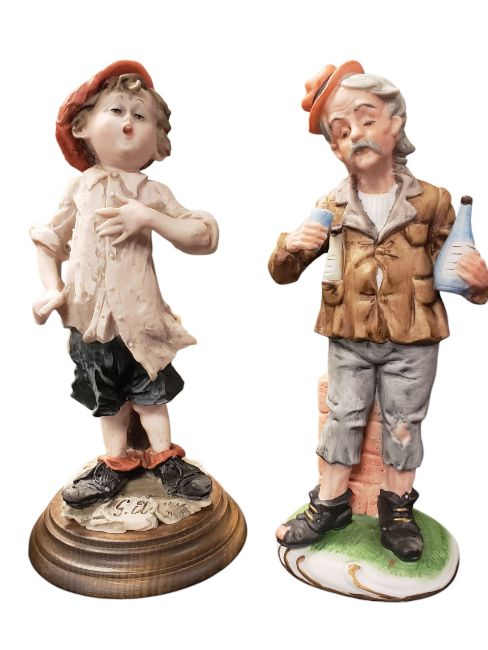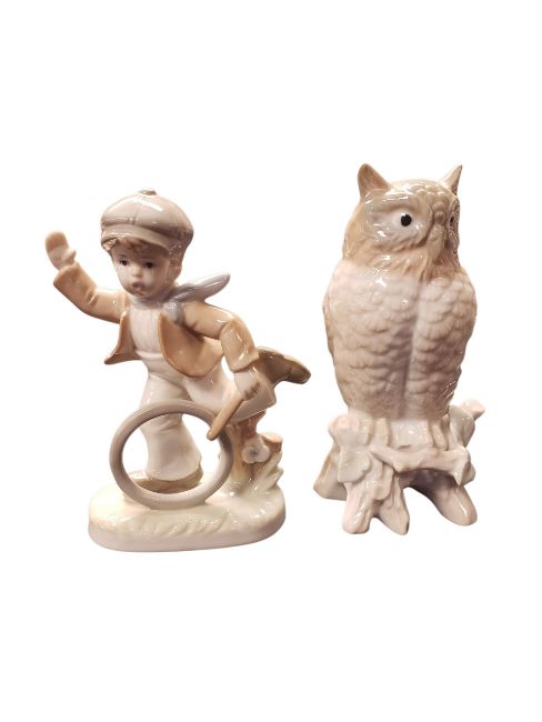 Collection of 20th century vintage porcelain figures. Comprising a Lladro Nao figure of a woman with a flower numbered 1392, three Carl Scheidig figures comprising an old woman, an old man and a young boy with a stick and a hoop, an unmarked owl figure, and a Giuseppe Armani resin figure of a boy raised on a circular wooden base. All apart from one marked to the base. Largest measuring approx. 28.5cm tall.