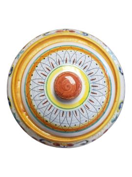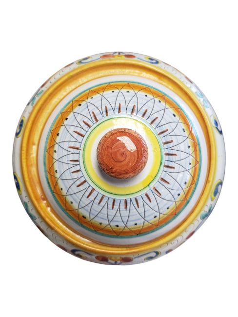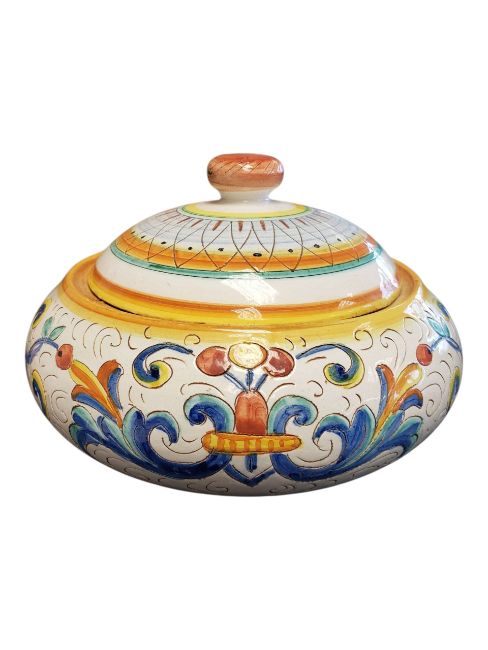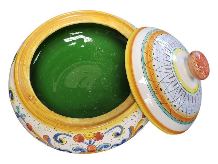 Two 20th century Continental Faience ware ceramic pieces. Comprising a Deruta marked lidded pot decorated with a foliate design in a blue, orange and yellow colourway, and a Heinrich Selb, German hand-painted bowl decorated with a central floral design in a blue and pink colourway. Both marked to the base. Bowl measuring approx. 22cm in diameter.