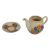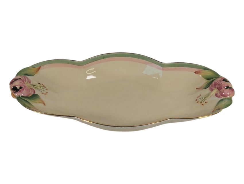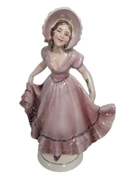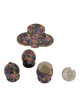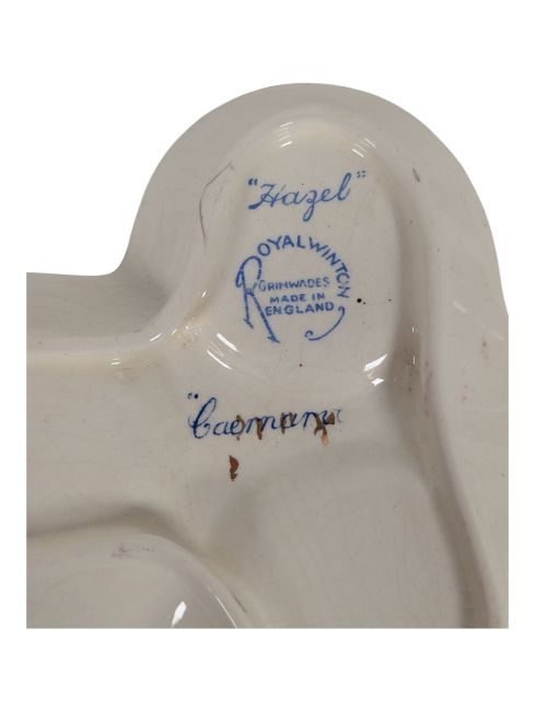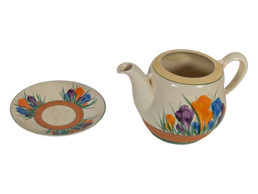 Collection of early 20th century Art Deco ceramic and porcelain pieces. Comprising a Clarice Cliff Crocus patterned teapot and saucer, a Katzhütte figure of a lady in purple, a Royal Winton Grimwades shaped trinket tray in the Honey Lily pattern, and a Royal Winton Grimwades "Hazel" cruet set. All pieces with the maker's mark to the base. Largest piece measuring approx. 26cm tall.