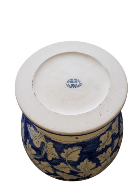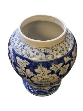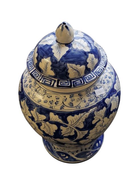A 20th century large Chinese blue and white export ware ginger jar. Decorated in blue and white colourway with flowers. Having lid atop, with pointed knop. Marked to the base