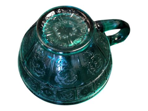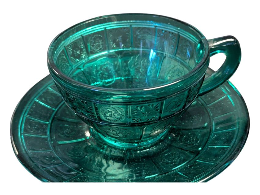 Jeannette Glass Company - Early 20th century American depression glass cup & saucer. In a clear green colourway in the Doric and Pansy pattern.