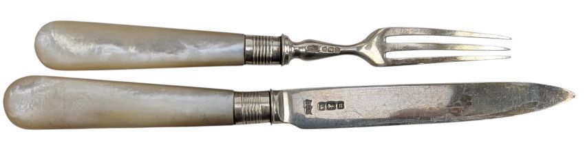 A cased 24pc Edward VII hallmarked silver and mother of pearl handled fruit forks & knives set. Hallmarked year 1905, Sheffield. Sponsors mark for Mappin & Webb. Completed in an original wooden box with maker's marks to the lid. Stamped RaNo 361869. With original key. Total weight approx 864g.