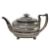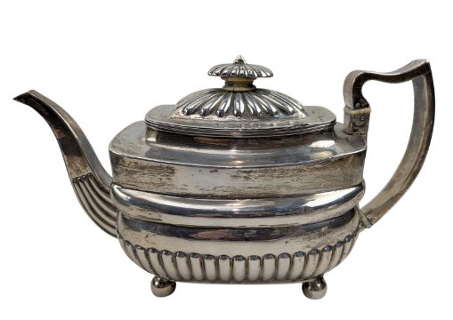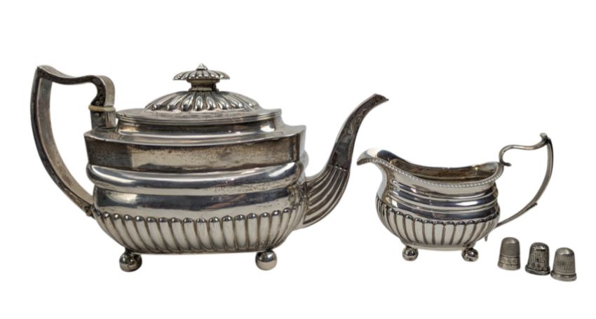 An 18th century George III hallmarked silver teapot. Hallmarked year 1789, London. Sponsors mark for Charles Hougham. Together with a George III hallmarked silver creamer jug. Hallmarked year 1814, London. Sponsors mark rubbed. Further together with three hallmarked silver thimbles. Total weight approx 800g. Submission ref WCMJYKHK.