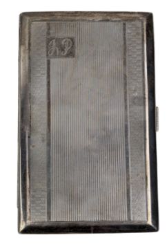 A 20th century silver cigarette case with engine turned decoration. Monogrammed JP. Stamped Barton Silver. Weight approx. 182g.