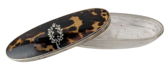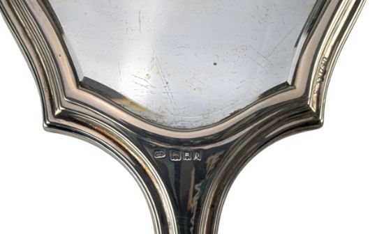 A George V hallmarked silver 6 piece dressing table vanity set. The set comprising a handheld mirror, two hair brushes, two cloth brushes and a silver & tortoiseshell lidded glass pot. Hallmarked year 1919, London. Sponsors mark for Charles Henry Dumenil. Total gross weight approx. 1011g.