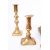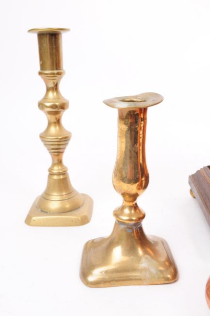 Collection of 20th century brass candlesticks and copper pieces. Comprised of two pairs of brass candlesticks, a copper kettle with the detached spout, a copper vase and a wooden plinth stand for the kettle. Largest piece measuring approx. 24cm x 21cm.