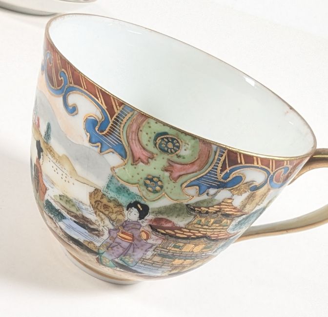 Noritake - An early 20th century Japanese porcelain china hand painted tea cup and saucer and side plate (trios). Hand painted water side Japanese scene with Japanese figures. With makers mark to underside. Measures approx. 17cm diameter.