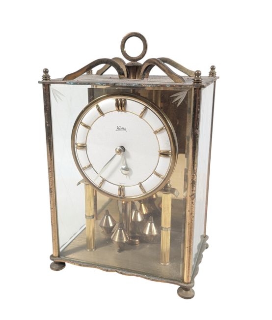 Koma, Getrmany - A vintage 20th century 1970s Koma mantel carriage / anniversary clock. Having ring top with finials to corner, white face with gilt chapter ring raised on feet. Koma branding to front and movement. Sold as untested. Measures approx 22x16x11cm.