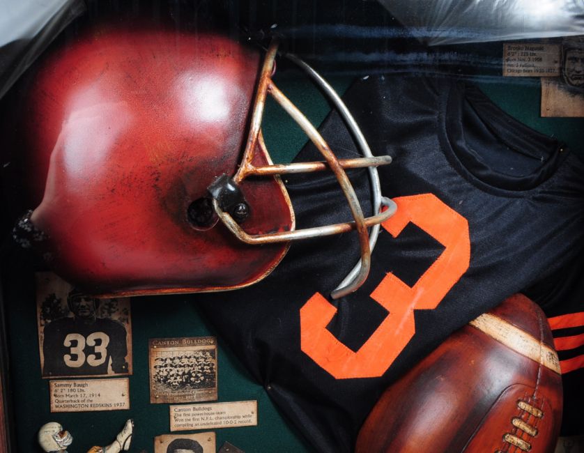 Late 20th century NFL commemorative display cabinet. Featuring a replica Vince Lombardi trophy, helmet, football and shirt, alongside cut outs of players and teams such as Sammy Baugh, Joe Greene and Boby Lilly. All housed in a glazed display cabinet. Measuring approx. 61cm x 61cm x 16cm.