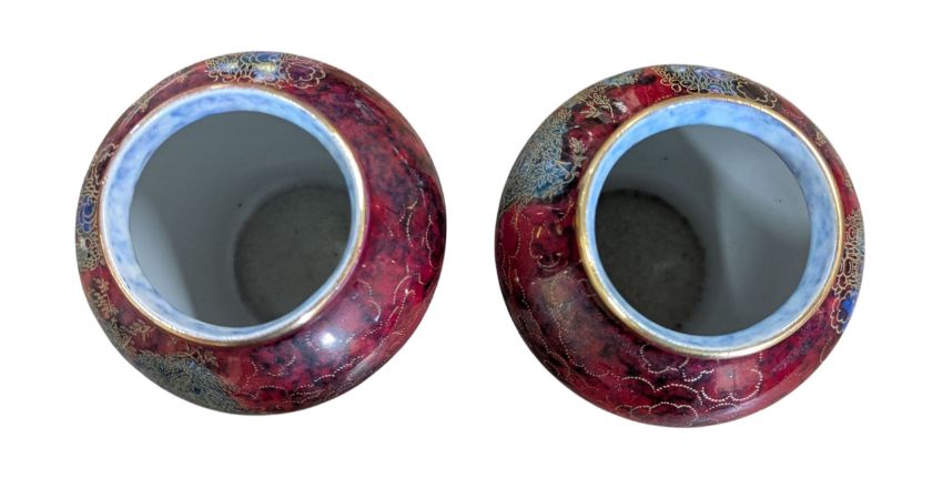 Pair of lustre ware baluster-shaped vases in red, blue and green colourways with gilt decorations, pattern 5375