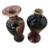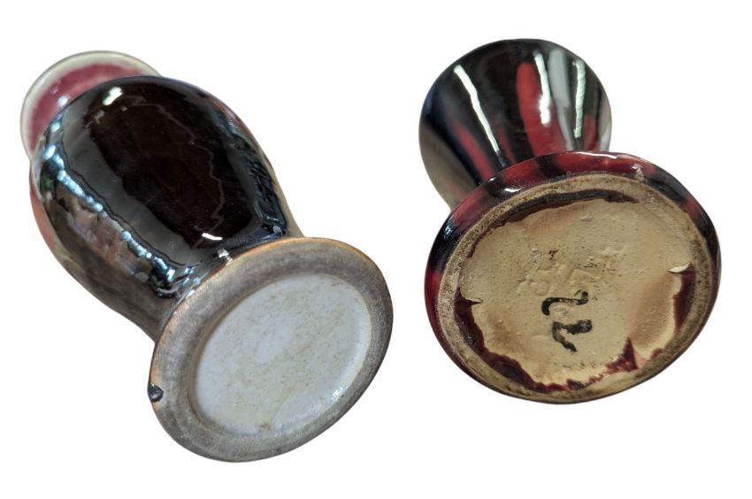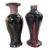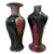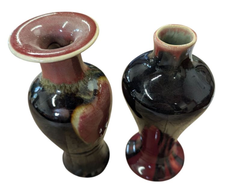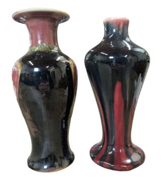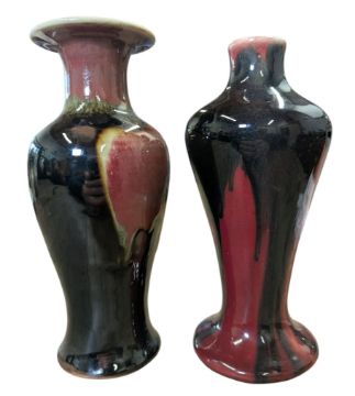 To include a black & red glazed baluster vase with flared foot, together with a flared neck red, green and black vase