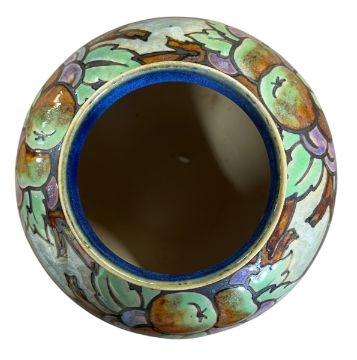Bulbous-shaped tube-lined pottery vase with fruit and grapes