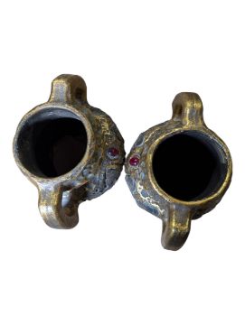Pair of Art Nouveau Gold lava ceramic twin handled vases with red glass on the shoulder