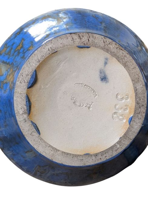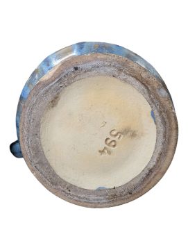 In a mottled blue and brown/pink crystalline glaze finish with a single handle