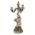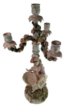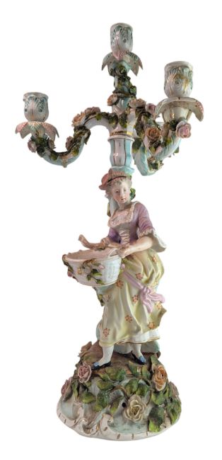 A circa 1900, late 19th-century/early 20th-century German Sitzendorf-style four-light porcelain candleabra. In the form of a woman in 19th-century dress with floral motif carrying a basket, raised on a decorative base with trailing flowers to base, stem and arms. Hand-painted in shades of green, blue, pink and yellow. Repairs to two of the arms and small chips to fingers. Unmarked to base, impressed with number 209. (3)