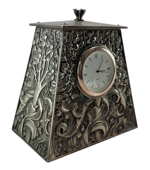 A modern embossed Art Nouveau-style silver-toned watch holder desk clock. Set with a quartz Japan movement. With a highly decorative embossed floral, tree and vine design. Watch mechanism detaches, with slight loss to the adhesive on the inner rim. The watch is held in place with tack. Sold as untested.