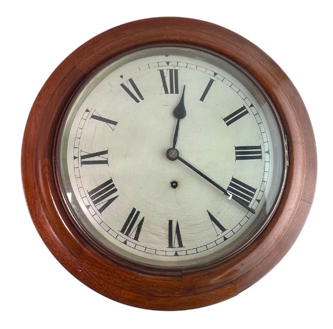 Two early 20th century mahogany cased wall clocks. Each with a 24 hours movement. The larger clock with Roman numerals to chapter ring, together with a smaller one with Arabic numerals to chapter ring (crack to glass front).