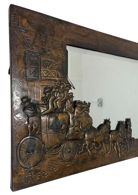 An Arts & Crafts early 20th-century embossed copper wall hanging mirror. The decorative mirror decorated with coach and horses, designed frame to left corner and a central bevelled edge mirror plate. Hanging chain to back.