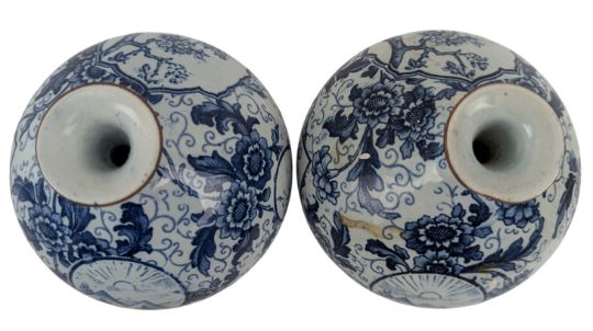 Three 19/20th century German ceramic vases. The lot to include a pair of 19th century Royal Bonn blue & white vases. Each globular-shaped vase decorated with flowers, trees & landscape. Marked and embossed marked to the base. Together with a 20th century German blue & white cylindrical vase decorated with flowers & birds with painted scissors mark to base.