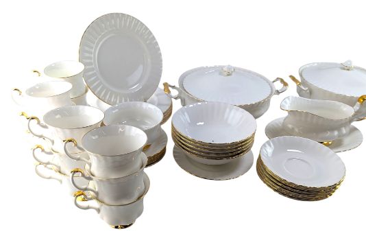 A large Royal Albert 'Val D'Or' china dinner, tea and coffee service to include: Teapot, Coffeee Pot, 6 teacups, 6 coffee cups, 12 saucers, 12 side plates, sugar, cream, milk, dinner plates, serving tureen, gravy boat etc. The pattern features a classic Montrose shape, which includes a slightly fluted or wavy edge and intricate, strong gold detailing on the rims and handles. Each piece is crafted from high-quality fine bone china, known for its durability, translucency, and resistance to chips and cracks. The Val D'Or pattern was introduced in the 1960s and was inspired by the Canadian city of Val-d'Or, Quebec, where a gold deposit was discovered.