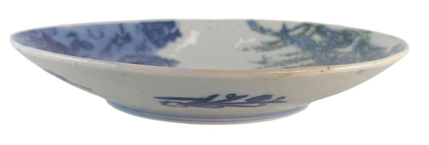 A 19th century Japanese late Meiji period Seikaiha transfer ware porcelain charger. The circular charger decorated with birds, sea waves and wisteria motifs. Sprigs of flowers to the exterior.