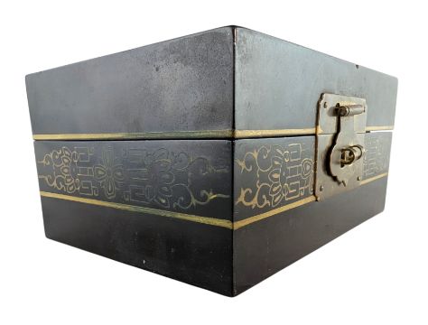 An early 20th century Chinese soapstone inset ladies' jewellery casket box. The appointed interior with tray. An ornate brass handle to the front.