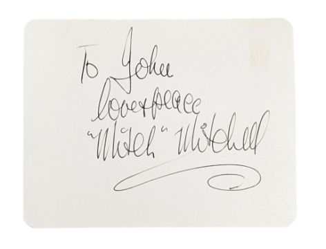 Music - Mitch Mitchell (English drummer, The Jimi Hendrix Experience) - autograph on a white 3.5x4.5" white card, signed by Mitchell in black ink, with dedication. (1)