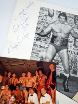 Wrestling - a large collection of autographs and signed photographs relating to c1960s and 1970s (some outside these dates) Wrestlers. Includes several notebooks of signatures, two autograph albums (variously filled), several signed programmes / 'Wrestling Review' brochures and a collection of signed photographs. Most unidentified, but names include: Pat Roach, Sky Low Low, Mick McManus, Johnny Saint, Joe Rostron (signed photo and letter), Count Bartelli, Jack Rowlands, Bert Royal, John Cox, Gentleman Jim Lewis, Big Bruno Elrington, The White Angels and many others.