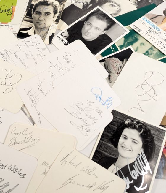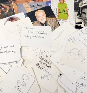 Autographs - a large collection of 100+ signatures, mostly unidentified. Known names include: Daphne Heard, Ronald Radd, Gloria Swanson, Earle & Vaughan, Eddie Blackstone, Roy Dotrice, Bernard Kay, Evelyn Laye, Grapevine (band), Martin Shaw, Anthony Head, Carol Kirkland, Martin Kemp, Omar Sharif, Bobby Bragg, Danii Minogue, Burt Kwouk, Walter Landauer, Anthony Quayle, various Gladiators, Hal Roach, Gavin Prime, Pub Internationale (with Harry Hill), The Karlins and others. All obtained from the 1960s to the 2000s by John Short, whose collection included actors, authors, circus performers, wrestlers, speedway, singers and film stars. (100+)