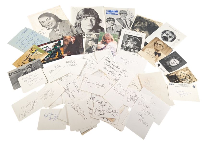 Autographs - a large collection of 100+ signatures, mostly unidentified. Known names include: Cannon and Ball, The Yetties, Peter Evans, Hazel Douglas, Al Dean, Moira Redmond, Anna Carerett, Denis Quilley, Benjamin Whitrow, Barry Cryer, Keith Scott, Robert Young, Jackie Andrews, Alan Curtis, Robin Askwith and others. All obtained from the 1960s to the 2000s by John Short, whose collection included actors, authors, circus performers, wrestlers, speedway, singers and film stars. (100+)